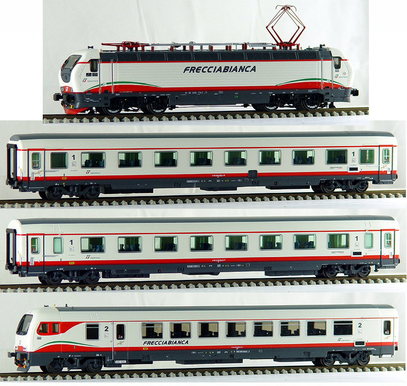 Set consists fro electric locomotive E 402 , two passenger cars 1st class type GC and control cab car type Z.