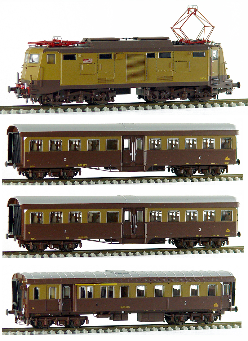 Set consists of electric locomotive E 424, two passenger cars 2nd class type Corbellini and control cab car type npABDz.