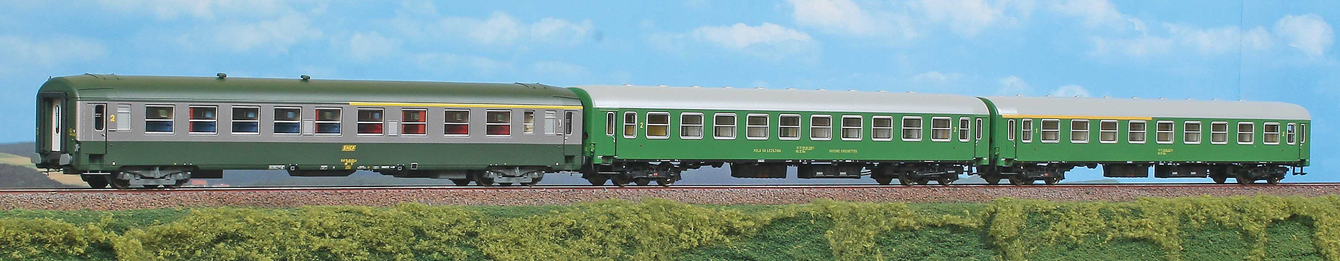 Set consists of SNCF passenger car 1/2class type A4B5 UIC (made by REE models), JZ passenger car 1st/2nd class and JZ passenger car 2 class