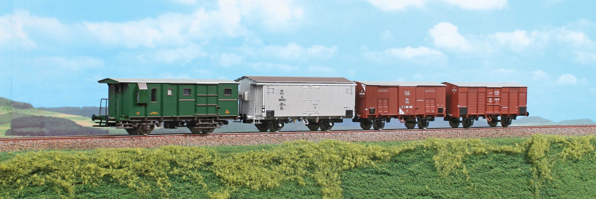 Set consists of Baggage car type Dm, Insulated car type Hg and 2 Box cars type F