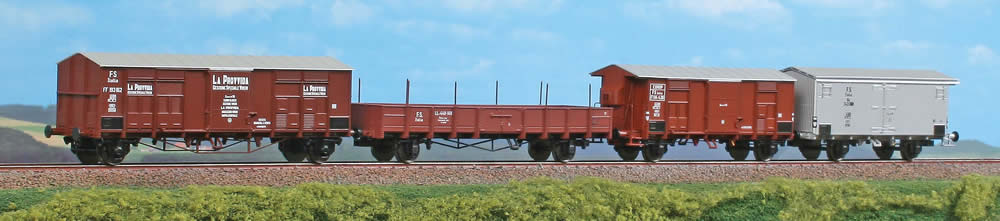 Set consists of Gondola car type LL , Box car type F , Insulated car type Hg and Box car La Provvida type FF .