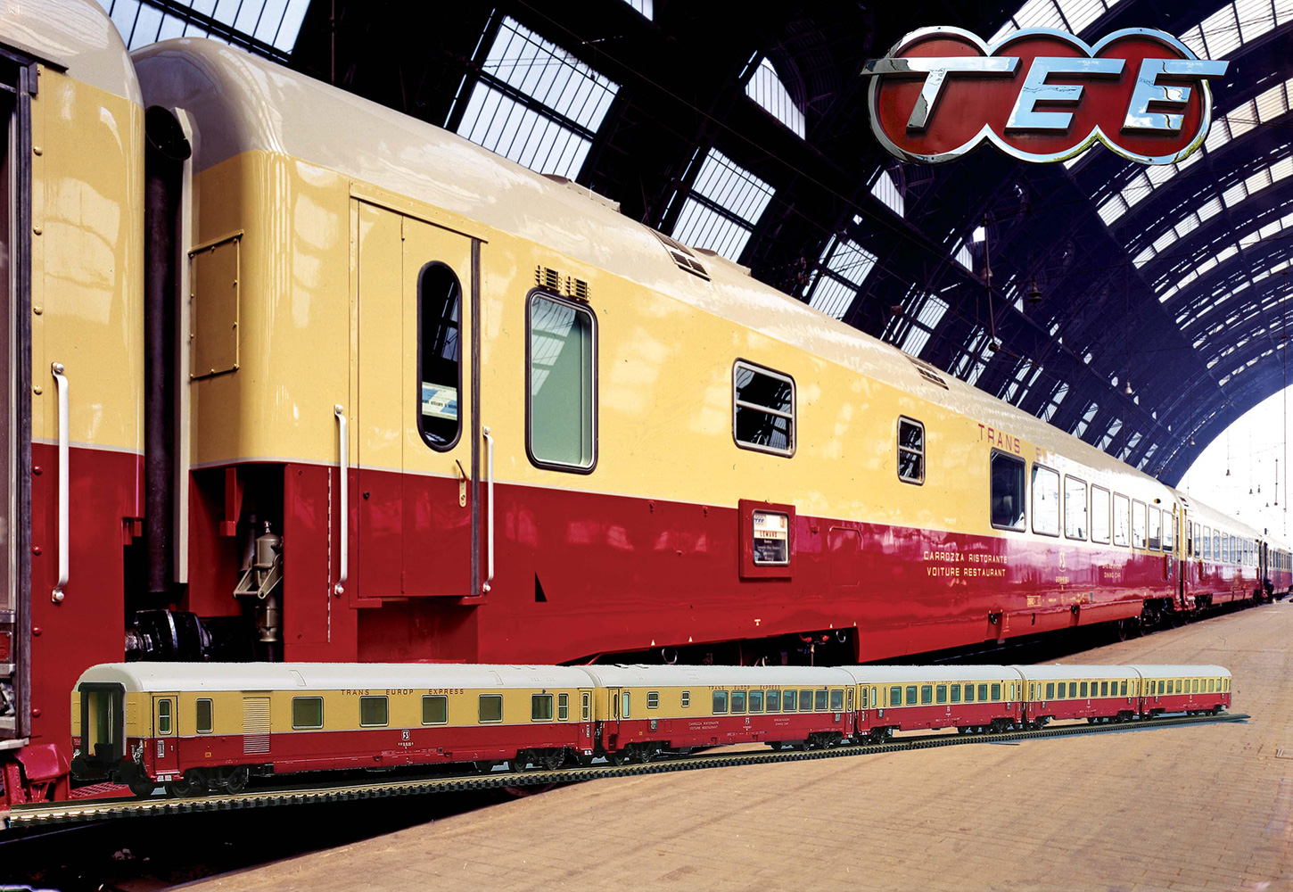 Set consists of Luggage/Generator car, Restaurant car, 2 compartment cars and Salon car. TEE Mediolanum has been one of the long-lived TEE service connecting Milano and Munchen since October 1957 up to June 1984; starting 1972 Italian Railways introduced the brand new TEE cars built by FIAT with dedicate livery; ACME model train shown as it was in end of Seventies when all cars received the class numbers on yellow painted area.