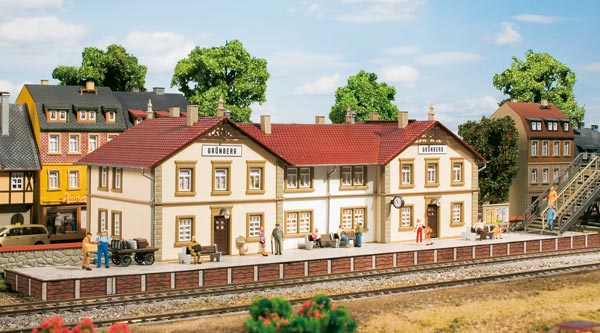 A small town station with many eye-catching accessories: platform, steps for the street side, clock, lamps, outdoor washbasins, arrivals and departures board and
