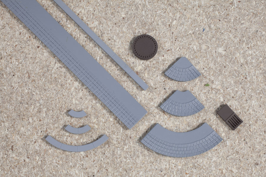 9 straight kerbs and 3 different curves each with matching gutters, 3 lowered kerbs each 37 mm, 6 manhole covers Ř 10 mm, 6 gully covers, and 6 covers for underground hydrants or sluice valves.