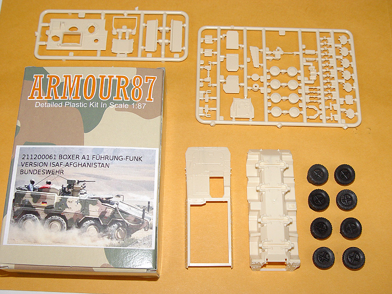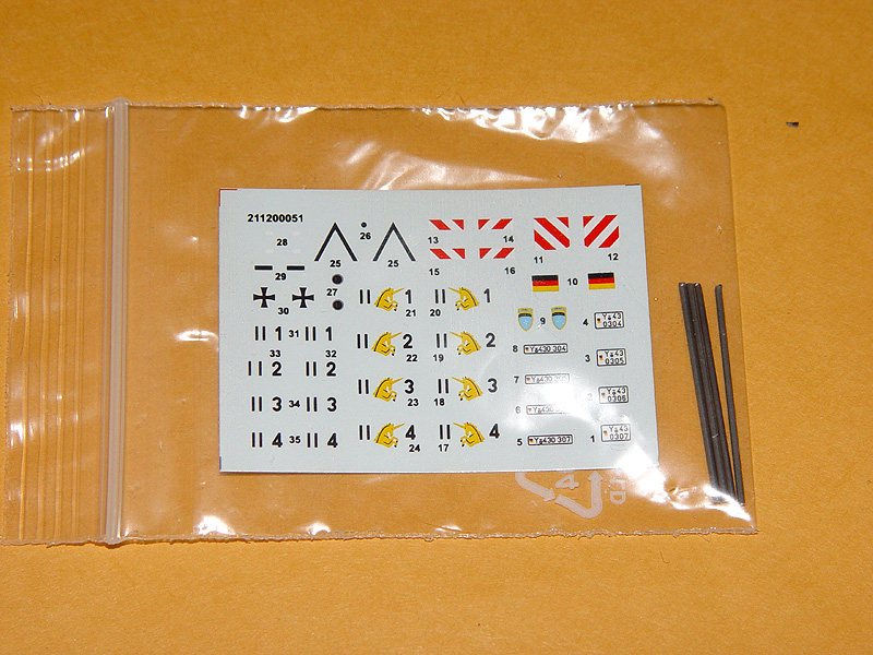 Unassembled plastic model kit with decals for four Bundeswehr vehicles . Pictured assembly instructions are included. Molded in light sand and black colors.