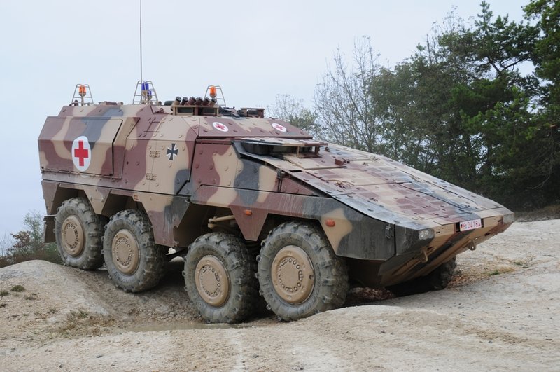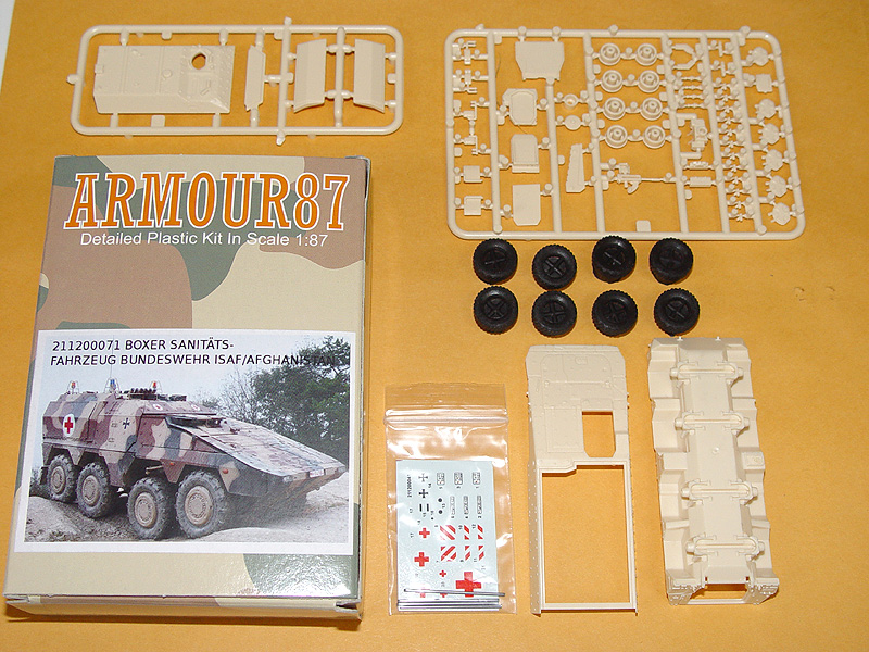 Unassembled plastic model kit with decals for three Bundeswehr vehicles . Pictured assembly instructions are included. Molded in light sand and black colors.