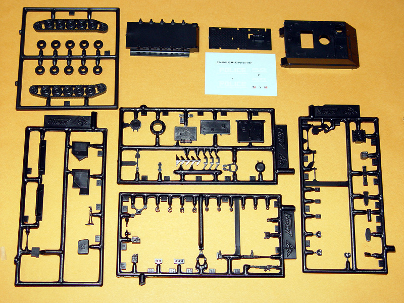 Unassembled plastic model kit molded in black color. Pictured assembly instructions and decals for 1 Police vehicles are included.