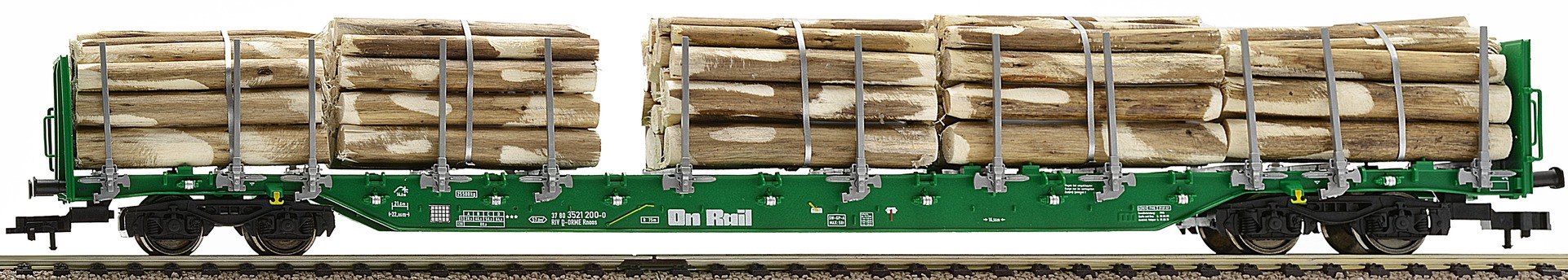 525407: 4 AXLE UNIVERSAL FLAT CAR TYPE RNOOS WITH TIMBER LOAD ONRAIL