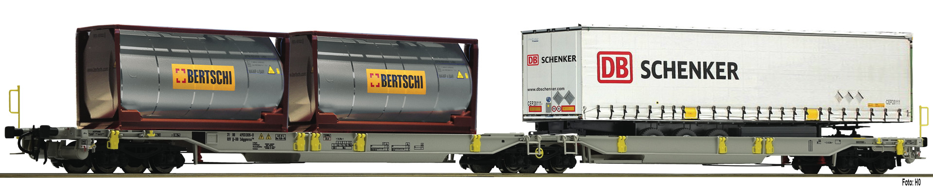 for use in the intermodal traffic. Coupler pocket according to NEM 355 standards and close coupling mechanism. Can be equipped with containers and semi-trailers. Wagon is made from metal die-cast material.