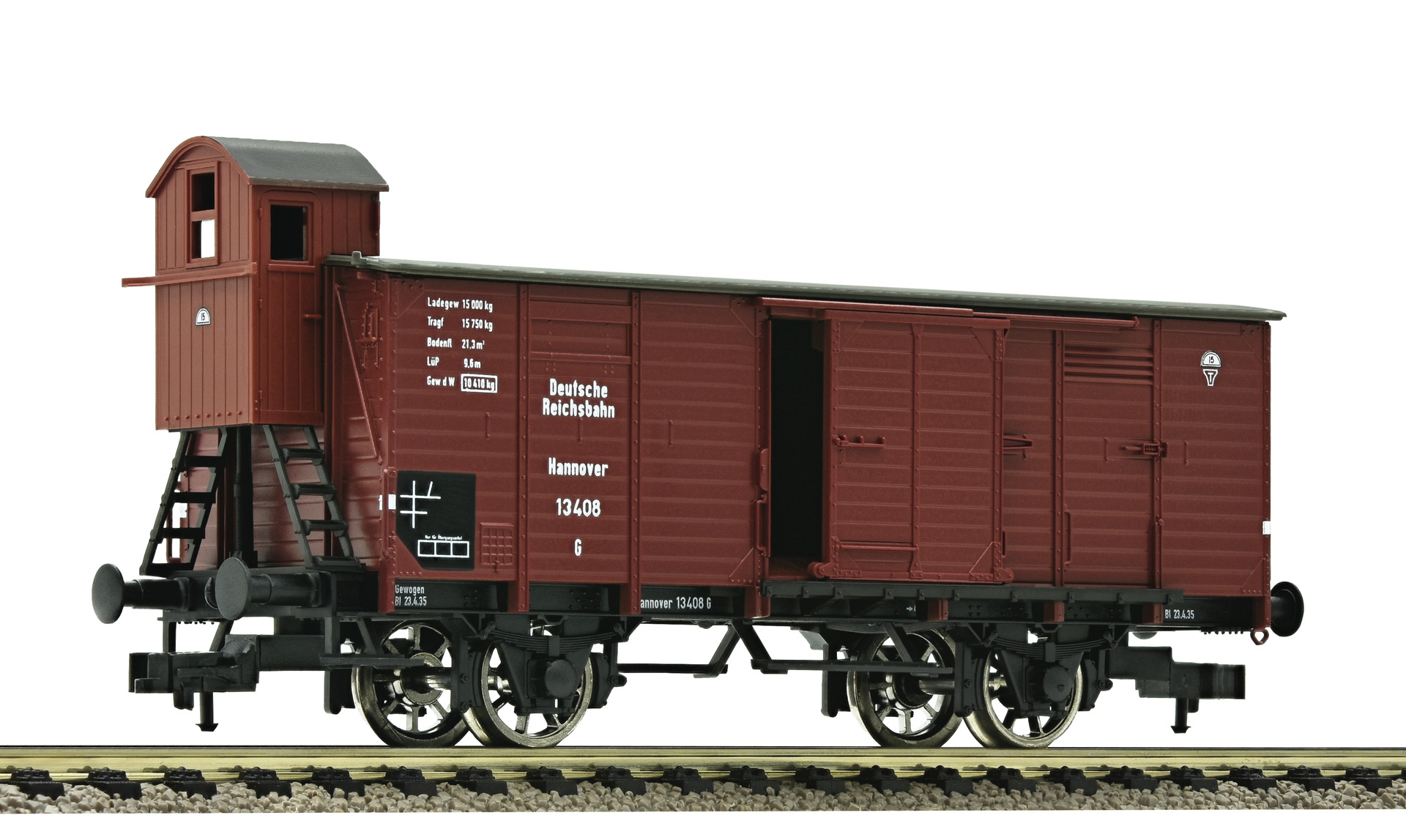 Model with two moveable sliding doors on each side. Coupler pocket according to NEM 362 standards with close coupling mechanism. Vehicle with spoked wheels and two moveable sliding doors.