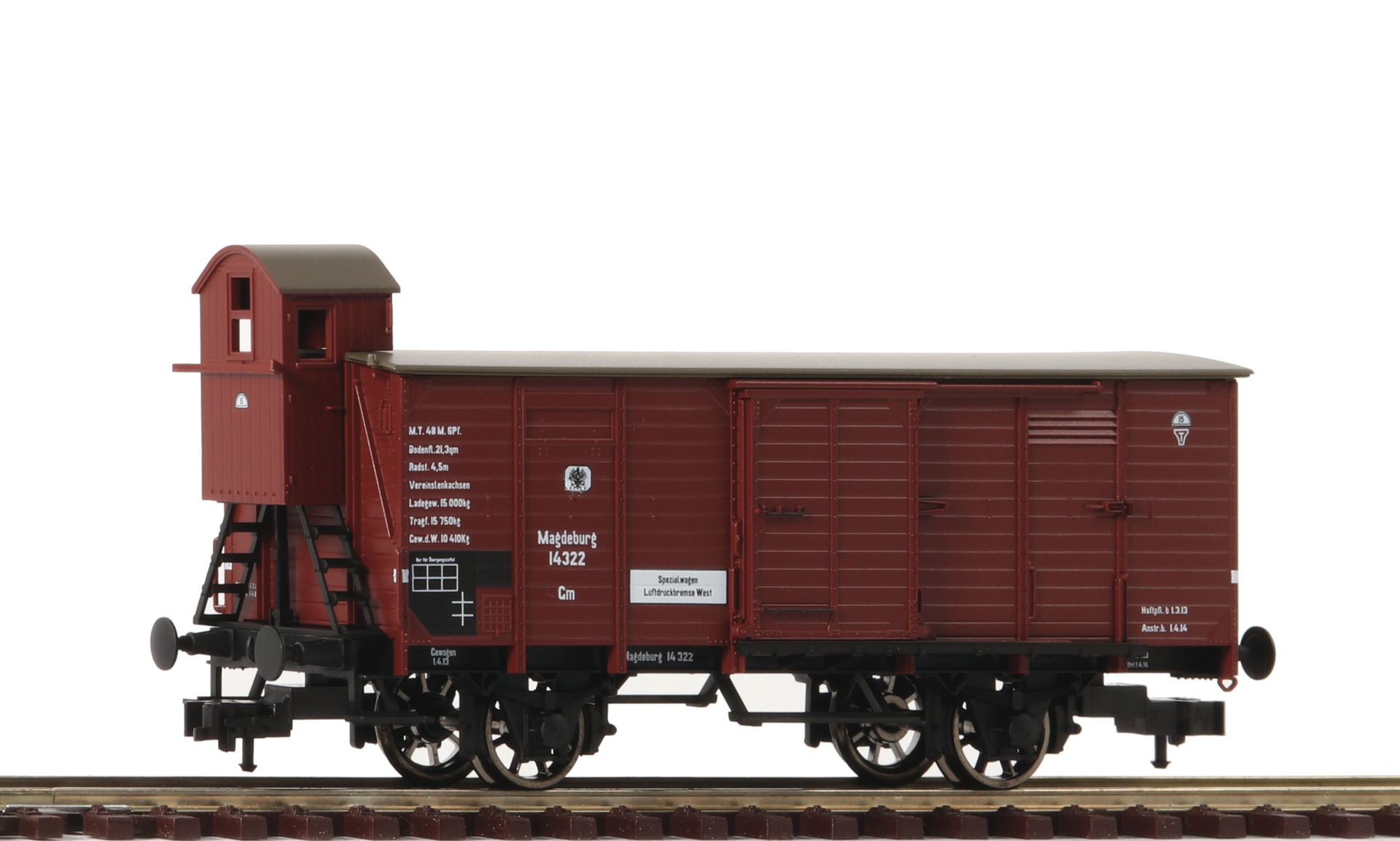 Model with two moveable sliding doors on each side. Coupler pocket according to NEM 362 standards with close coupling mechanism. Vehicle with spoked wheels and two moveable sliding doors.
