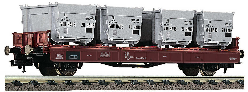 Model in true to original livery and lettering. The wagon carries 4 detachable containers Von Haus zu Haus. It is perfectly combinable with blocktrains. Coupler pocket according to NEM 362 standards and close coupler mechanism