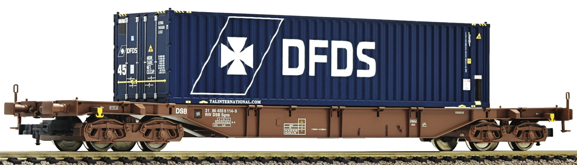 The wagon carries two detachable containers of the company "DFDS LOGISTICS". Coupler pocket according to NEM 362 standards with close coupling mechanism.