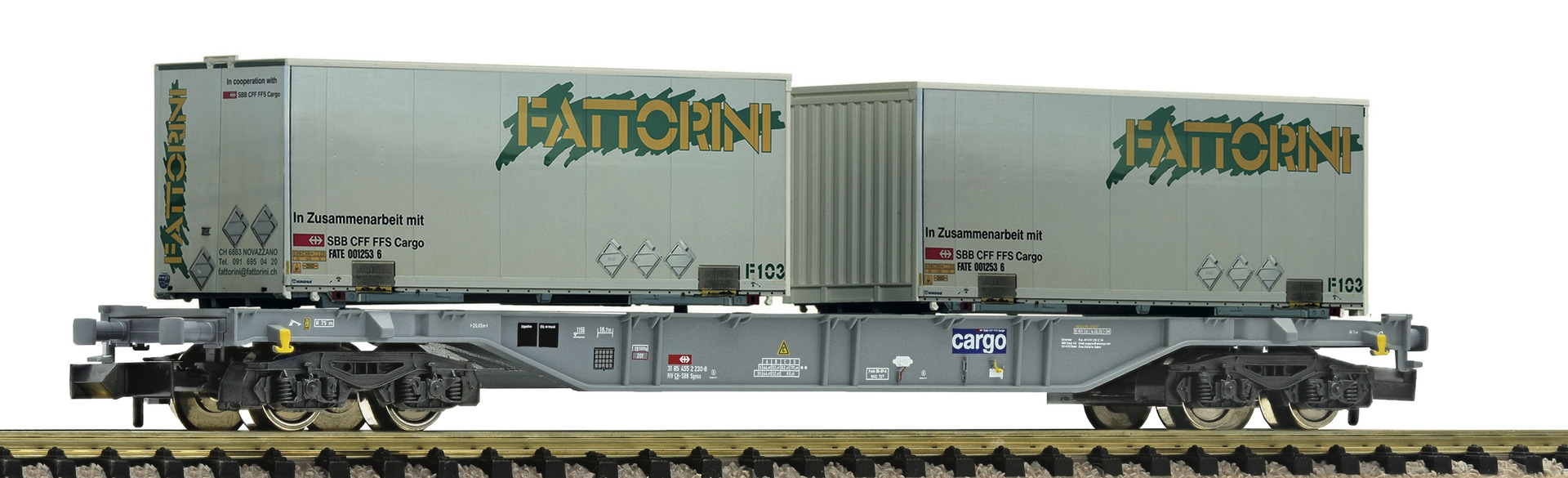 he model carries two swap bodies from the company FATTORINI. Livery and inscriptions true to the original model. Coupler pocket according to NEM 355 standards and close coupler motion link.