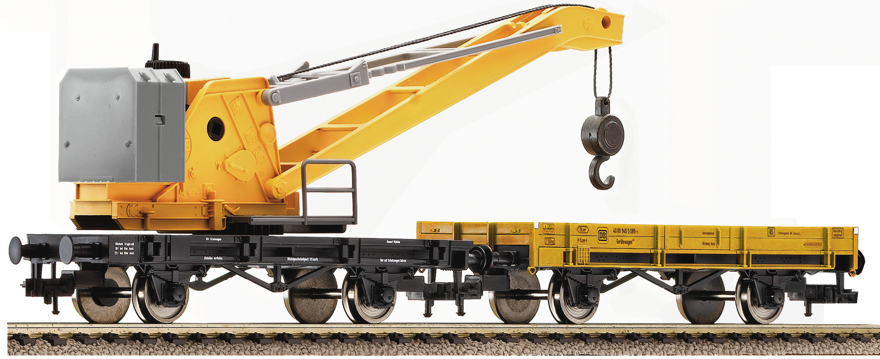 The set consists of one 10 t slewing crane wagon and one match truck. Crane jib can be raised or lowered. The crane is rotatable. Both models are available with PROFI couplers and metal wheels.