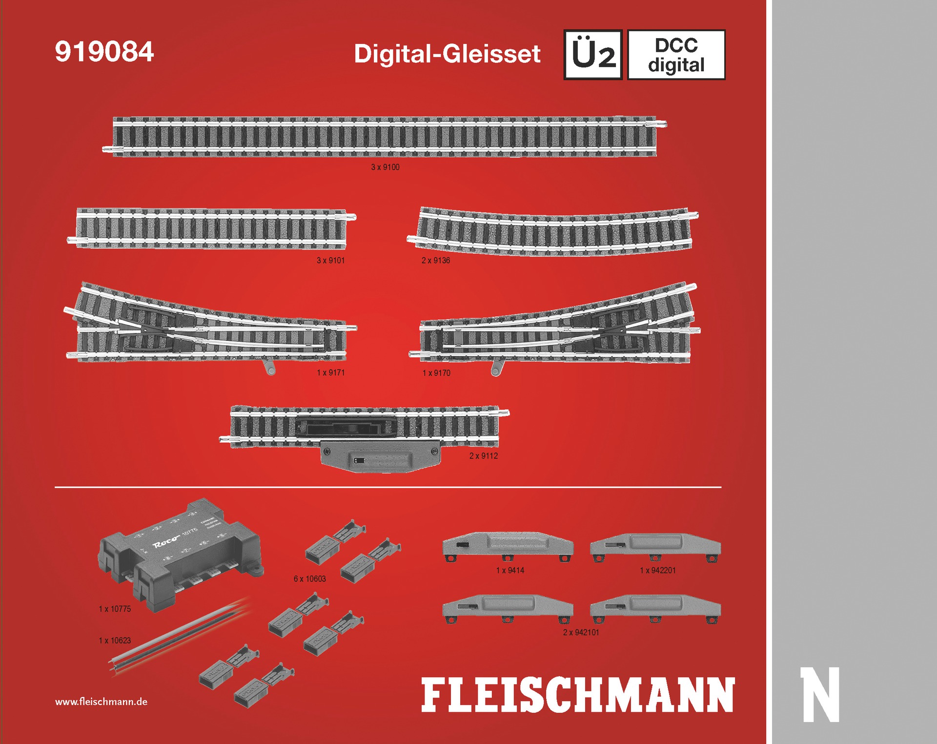 Contents: 3 straight tracks 9100, 3 straight tracks 9101, 2 curved tracks 9136 (opposite curve for points), 2 uncoupler tracks with electric motor 9112, 1 x 9414 (clip-on electric motor for manual uncoupler track 9114),