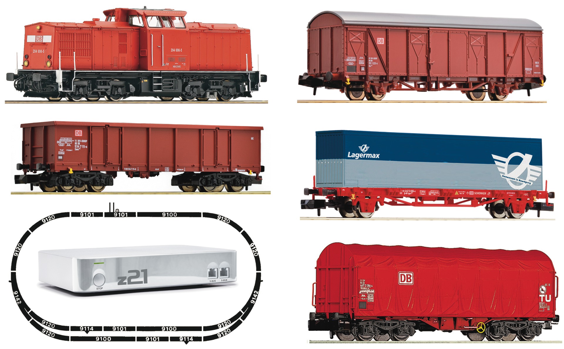 Complete digital starter set that promises lots of fun. Contents: 1 Diesel locomotive series 204 with load controlled decoder, 4 freight cars, 1 z21 digital center station (WLAN router included), 7 straight tracks (3 x9100, 3 x 9101, 1 straight feeder track), 8 curved tracks 9120, 2 uncoupling tracks 9114, 1 left curved turnout 9168, 1 right curved turnout 9169 and 1 rerail equipment 9480. All tracks form an oval railway layout with a track radius of R1 and a long passing loop. Length of track approx. 3,20 m. To operate, a Smartphone or tablet PC is required.