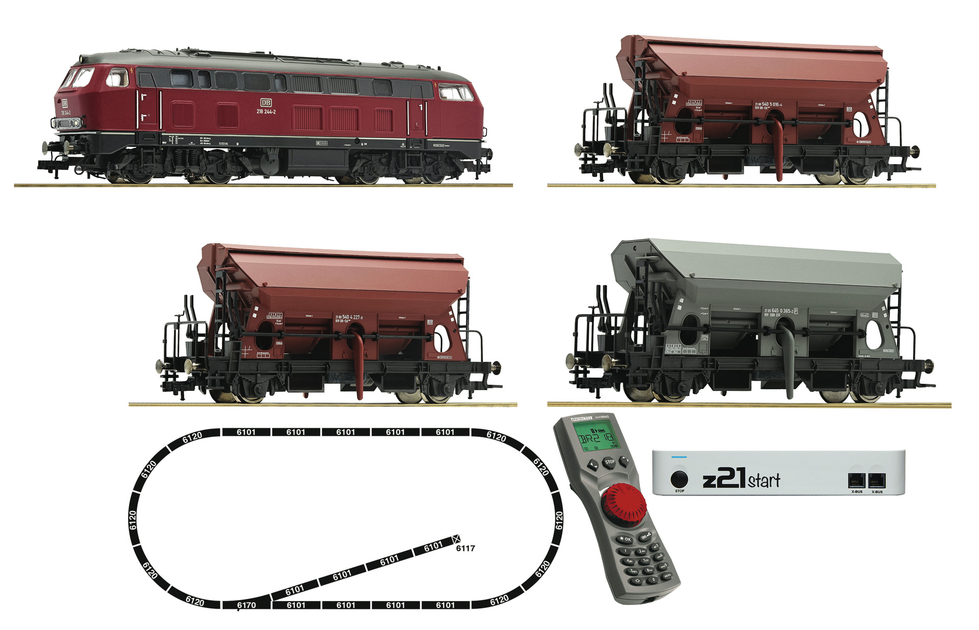 Contents: * 1 Digital Diesel locomotive BR 218 (with DCC Decoder) and light change that switches with the direction of travel * 1 Goods train wagon set * 1 FLEISCHMANN multiMaus * 1 Transformer 110v * 1 z21start * Fleischmann Profi tracks to build an oval track layout with holding siding * Tracks: 13 x 6101, 10 x 6120, 1 x 6170, 1 x 6116 buffer stop * Dimensions of track layout: 175 cm x 75 cm. * Electric connecting materials All Fleischmann multiMAUS advantages at a glance: Store up to 9.999 locomotives on the layout and control any one of them by keying in their number + 64 locomotive addresses can be stored in the database + up to 21 functions per locomotive can be activated + speed steps: 14, 28 or 128 + up to 1.024 switchable solenoids.