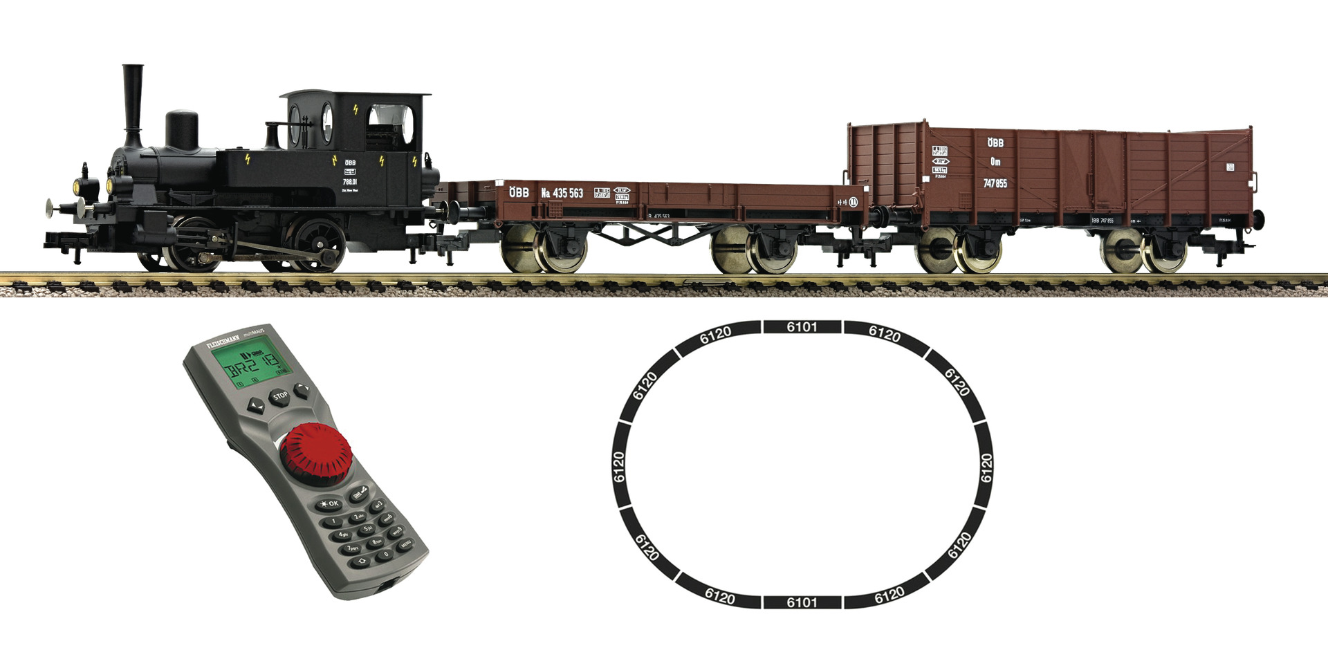 Contents: - 1 digitally controlled tank locomotive (with DCC decoder) and light changeover that changes with the direction of travel - 2 freight cars - 1 FLEISCHMANN multiMaus - 1 transformer - 1 amplifier - 1 PROFI track (2 x 6101, 10 x 6120) - 1 rerailer 6480 - 1 electric connection elements Train length: Approx 310 mm. Dimensions of track layout: 95 cm x 75 cm.