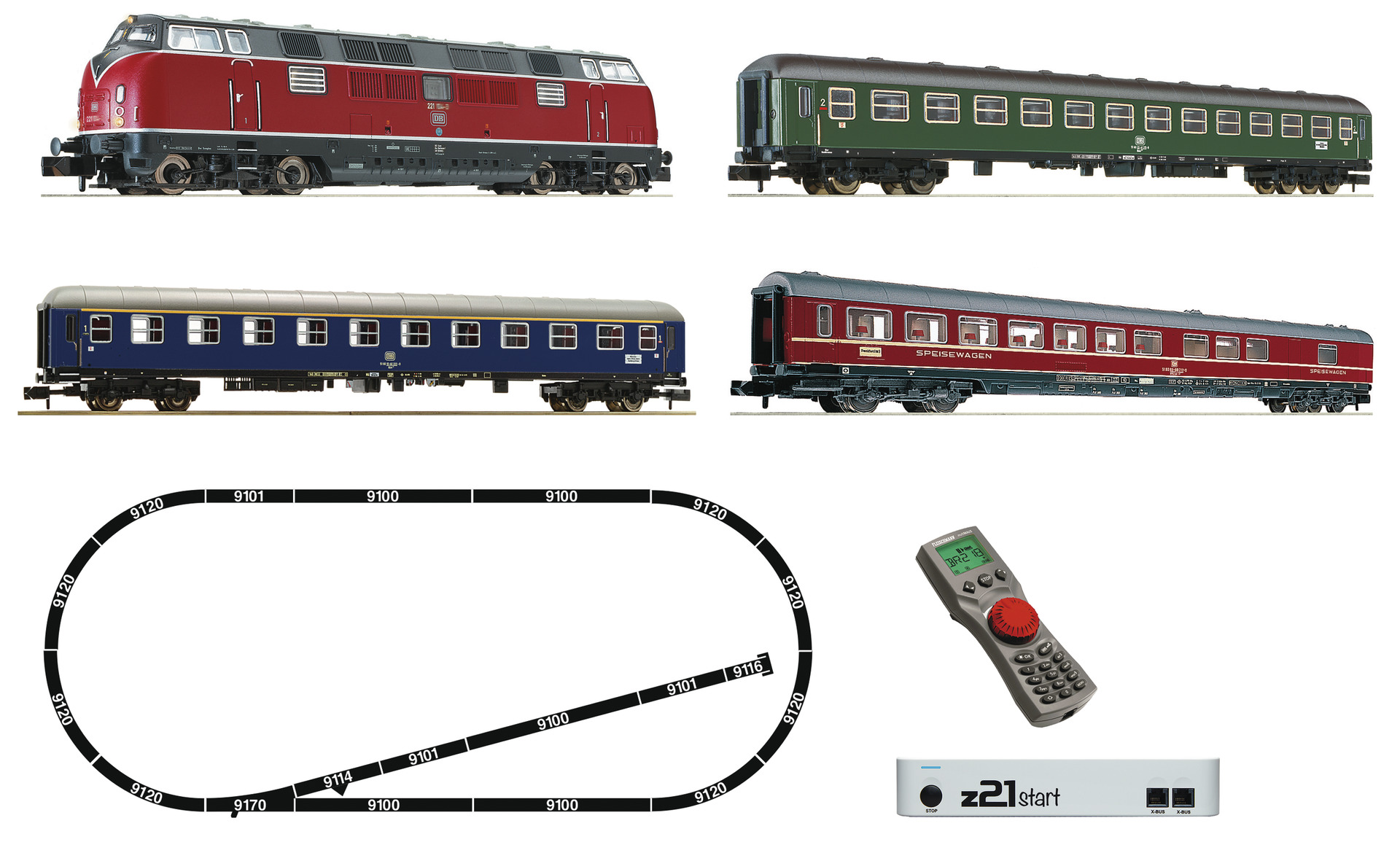 Contents: - 1 digitally controlled diesel locomotive BR 221 (with DCC decoder) and light changeover that switches with the direction of travel - 1 3-piece set express train wagons - 1 FLEISCHMANN multiMaus - 1 z21start* - 1 plug-in power supply - Tracks for an ovale track layout with radius R1 and siding (5 x 9100, 3 x 9101, 1 x 9114, 8 x 9120, 1 x 9170, 1 x 9116) - Electrical connection elements. Dimensions of track layout: 96 cm x 40 cm