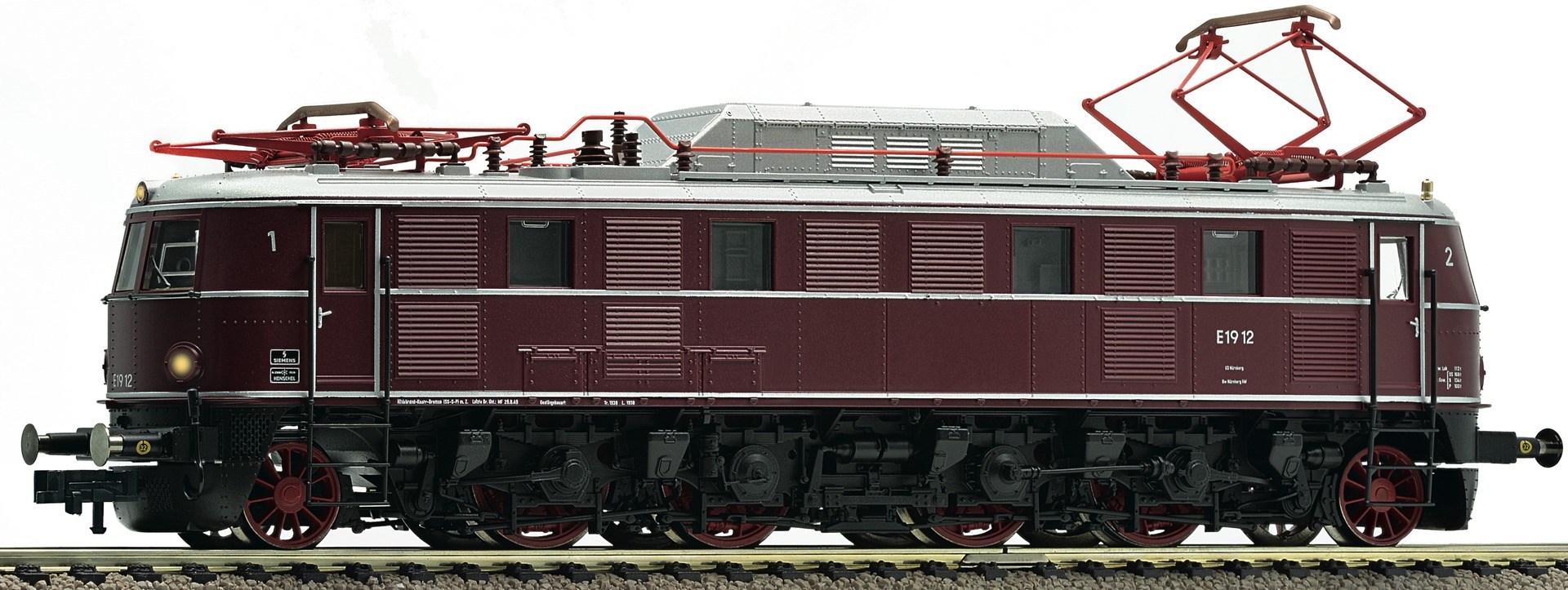 Version in wine red livery of the former DRB. The E 19 12 did not change the colourful red livery of her DRB times during operating at the new German Federal Railways, until after December 1952. It was self-evident that the conspicuous "Reichsadler" had been taken off and replaced by the locomotive number.