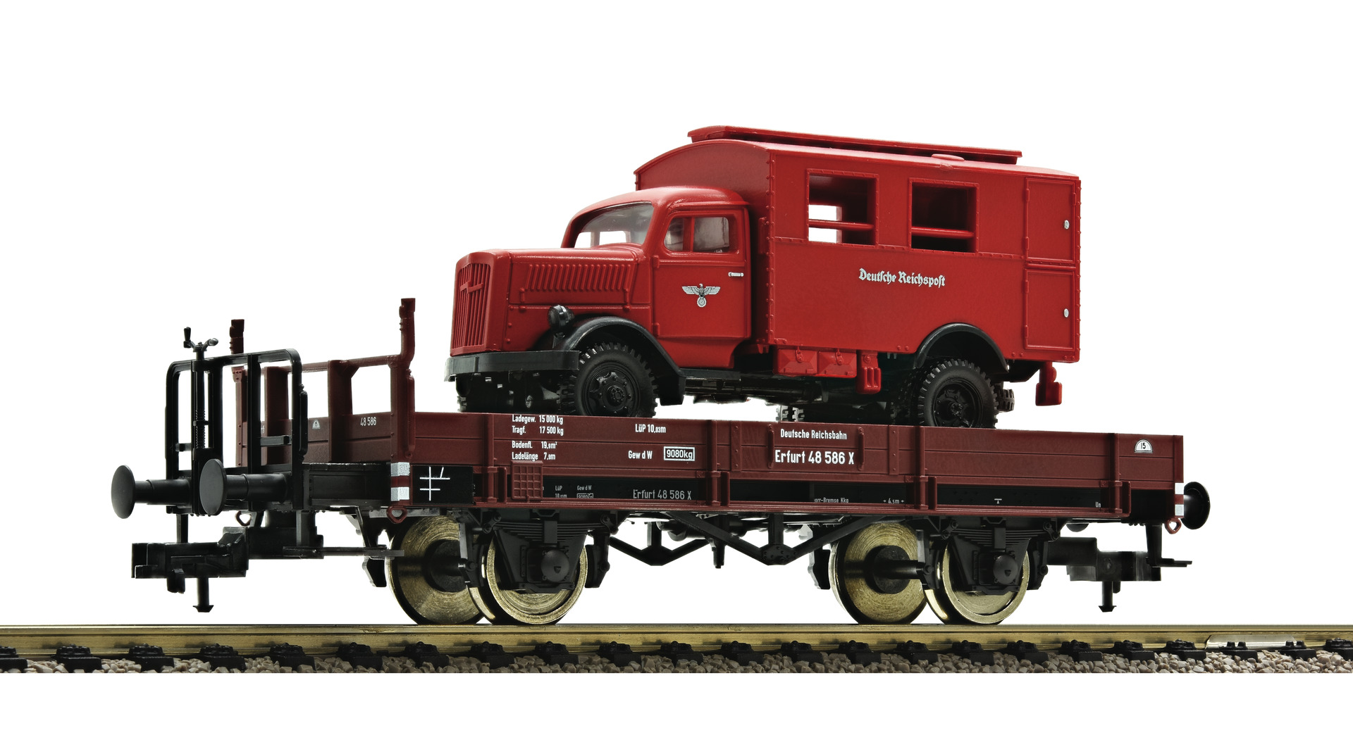 Flat car loaded with opel blitz of the Deutsche Reichspost<br /><a href='images/pictures/Fleischmann/Fleischmann-525302.jpg' target='_blank'>Full size image</a>