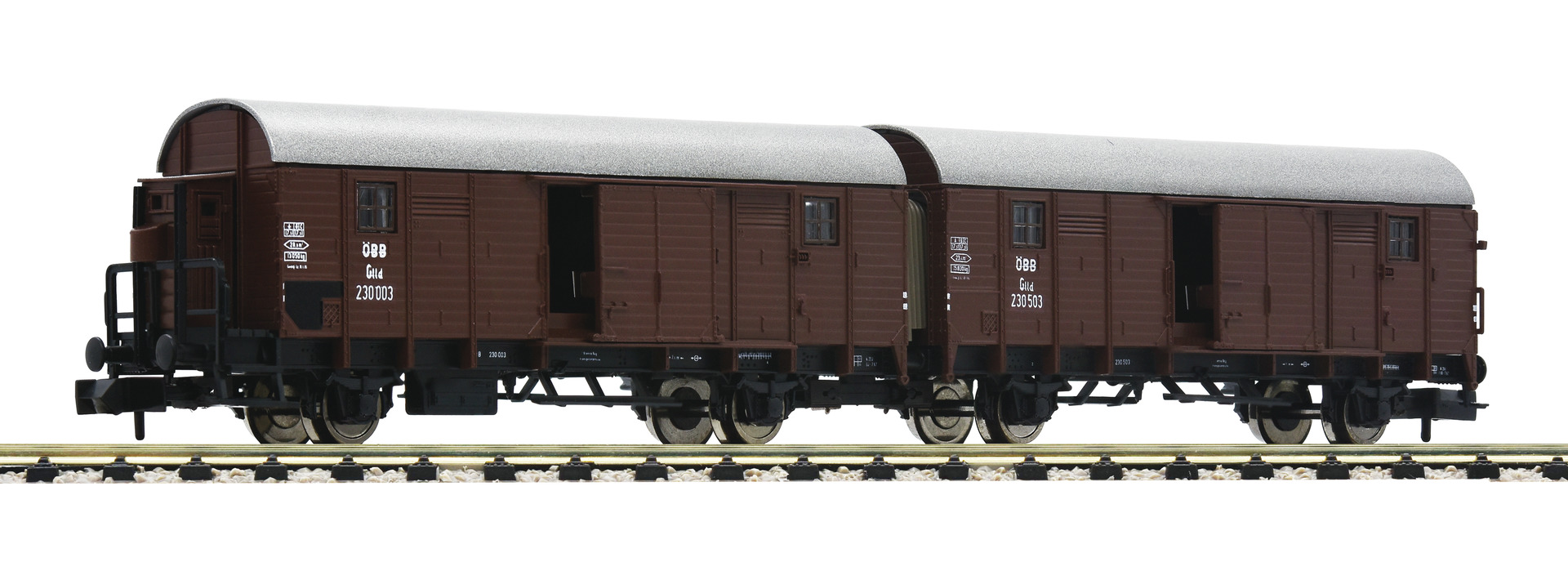 One of the cars has a brakeman's cab. Each wagon is equipped with two moveable sliding doors. Coupler pocket according to NEM 355 standards and close coupling mechanism. Prototype: This Leig-Wagen unit consists of two coupled boxcars and are connected via a closed corridor. Each car has small side windows.