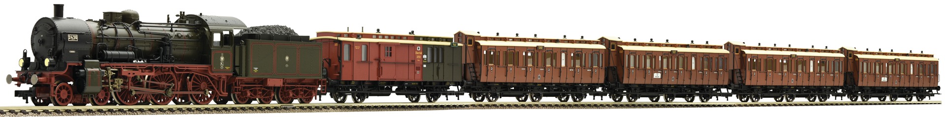 One-time special series "Prussian passenger train" K.P.E.V. Epoch I. Fleischmann presents with this one-time special series a typical passenger train of the Epoch I in 2015. The train is hauled by the legendary P8. Model with built-in load sensing digital decoder and sound true to the original from factory. All vehicles are equipped with standard jackshafts and interior design. The passenger wagons feature close coupler motion links. Locomotive with double headlight. The wagons are equipped ready to install interior lighting.