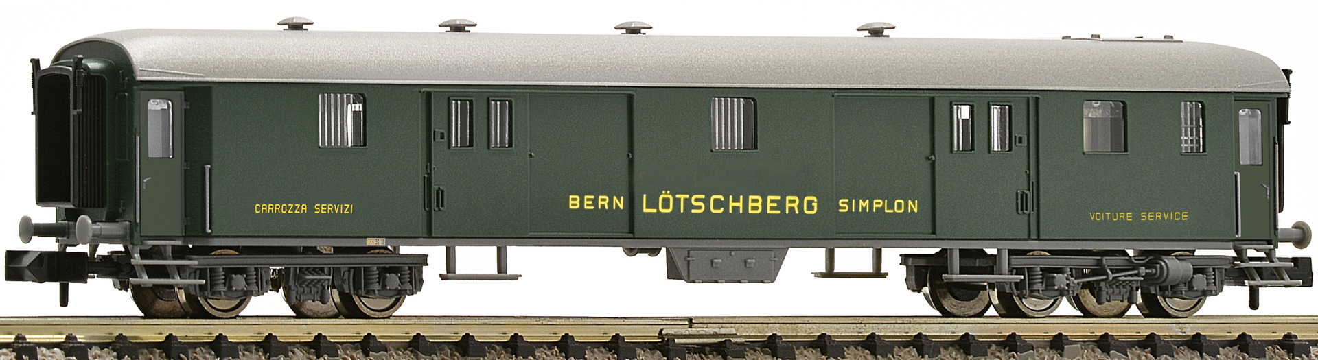 Furnished model in true to the origianl livery and lettering. In-plane assembled windows. The coach is ready equipped for the installation of interior lighting. Close coupler motion links on each end of the locomotive for close coupling operations. Close coupler pocket according to NEM 355 standards. The service coaches are converted luggage wagons of the SBB.