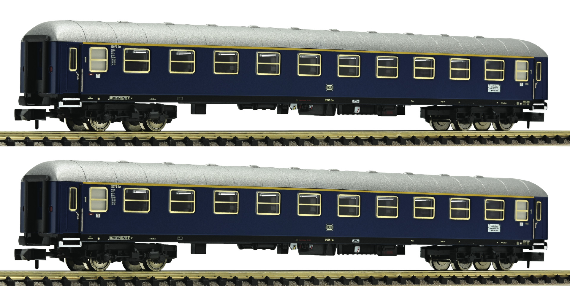 The set consists of two 1st class wagons type A4üm. The model has interior furnishing. True to the original livery and lettering. In-plane applied windows. the wagons are equipped ready to install interior lighting. NEM 355 coupler pocket with close coupling mechanism.