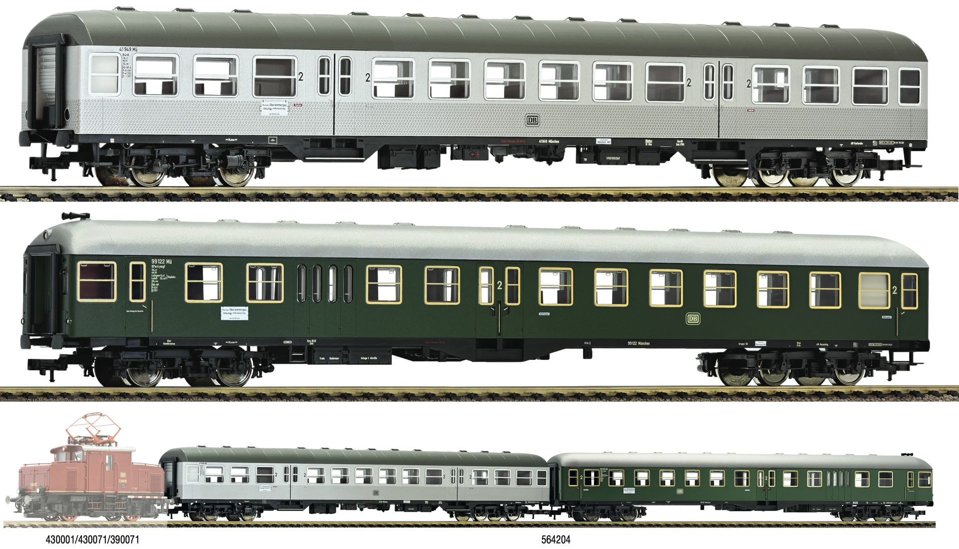 The set is perfectly suitable to the locomotive E 69 05 (Item 430001). In true to the original livery and lettering. In-plane applied windows. The model has interior furnishing and is equipped ready to install interior lighting. Coupler pocket according to NEM 362 standards with close coupler motion link for close coupling. The driving trailer is equipped with an integrated function decoder that makes the light changeover in analogue as well as digital mode possible.