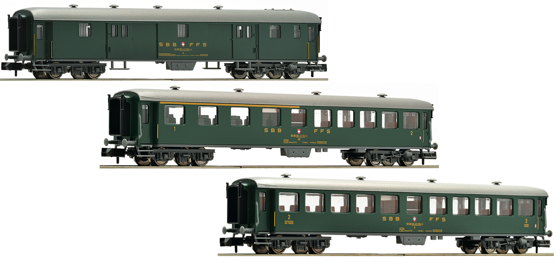 he set contains one baggage wagon, one 1st/2nd class coach and one 2nd class coach. This coach has a different running number than the wagons from the set 881814.