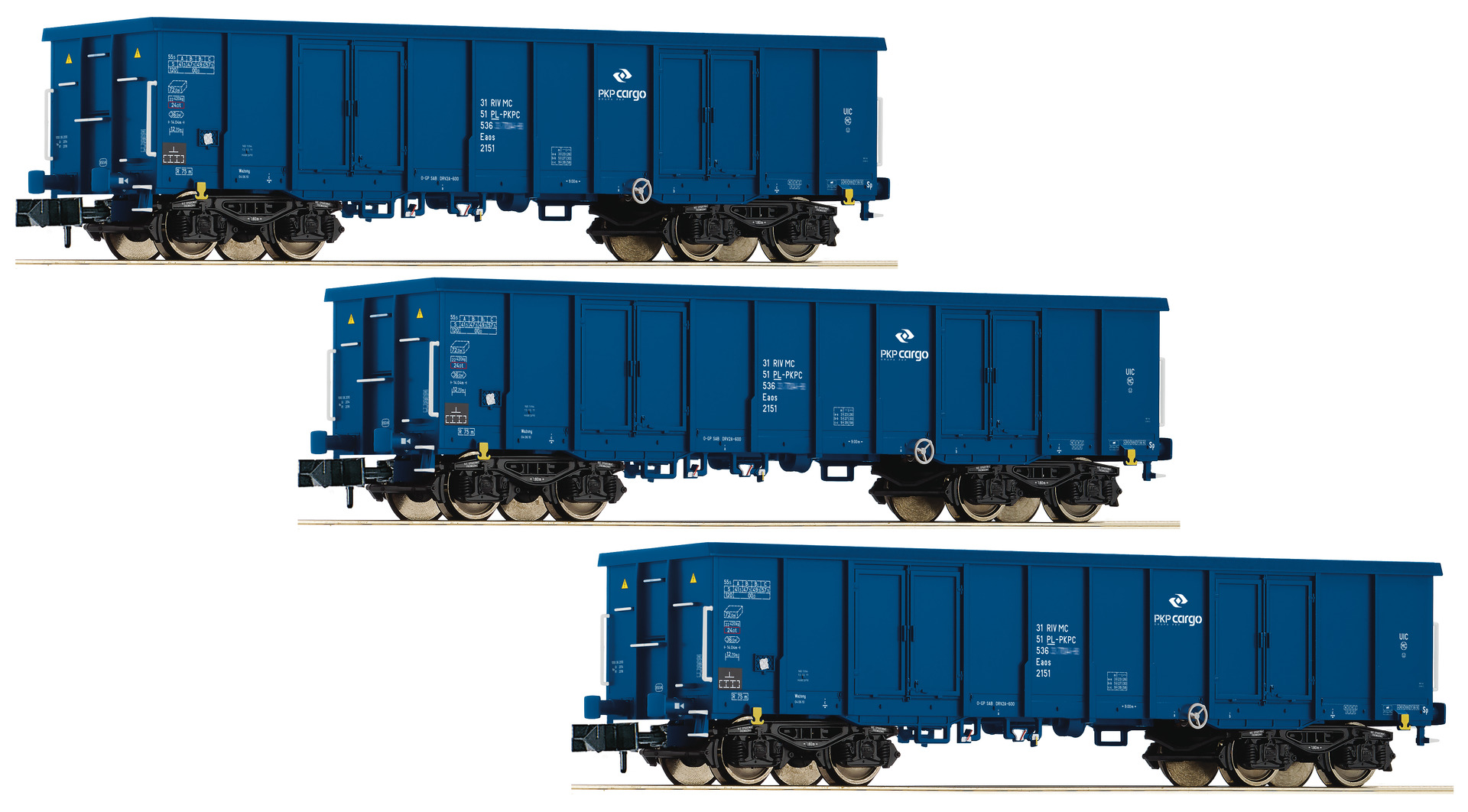Close coupler pocket according to NEM 355 standards and close coupling mechanism. The wagons have different running numbers.