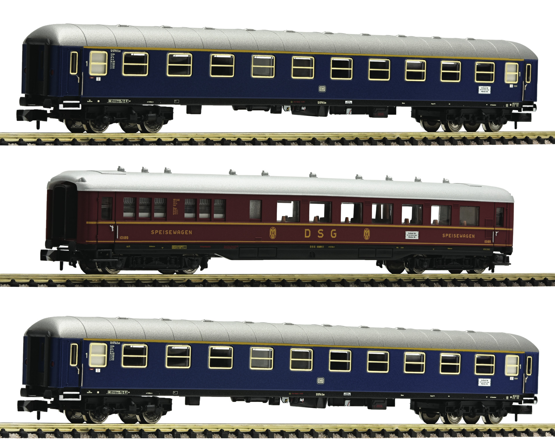 The model has interior furnishing. True to the original livery and lettering. In-plane applied windows. The wagons are equipped ready to install interior lighting. NEM 355 coupler pocket with close coupling mechanism.
