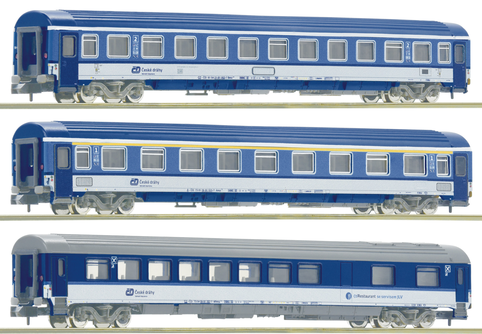The set contains one 1st/2nd class coach, one 2nd class coach and one dinging car of the CD. The model has interior design. Lettering and livery true to the original. In-plane assembled windows.