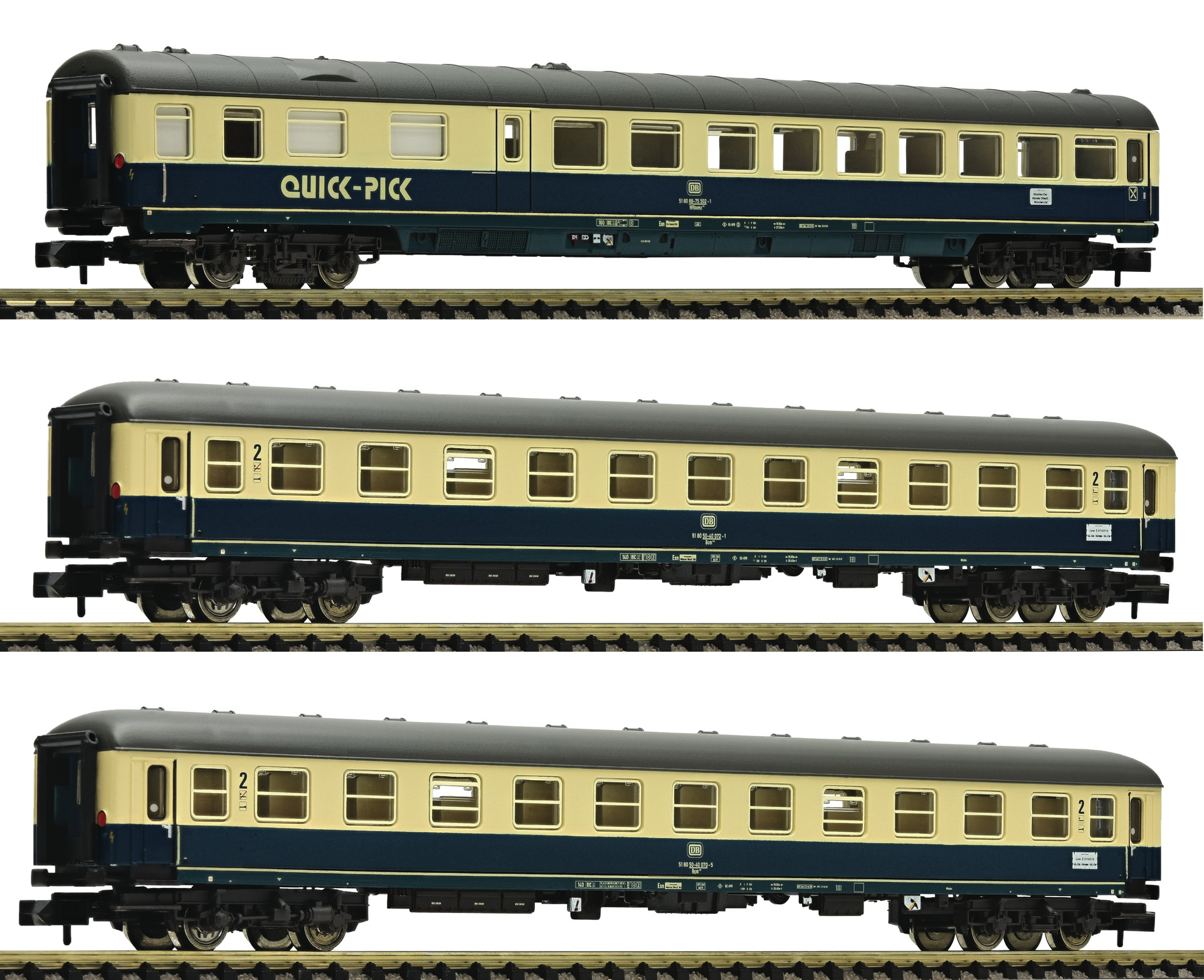 Passenger carriages with interior design, true to the original livery and labeling. The models feature in-plane applied windows and are technically prepared for the installation of interior lighting. All wagons are equipped with coupler pockets according NEM 355 standards and close coupling mechanism.