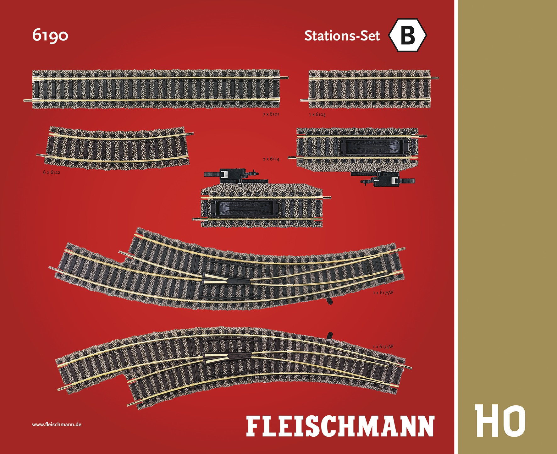 Contents: 8 straight tracks (7 x 6101, 1 x 6103), 2 uncoupler tracks 6114, 6 curved tracks 6122, 1 pair of curved points 6174 /6175.