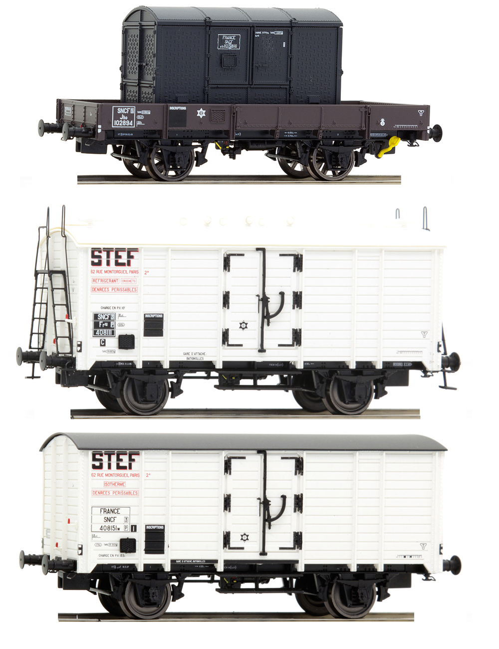 Set of 3 Freight cars consists from Flat car type 19 Jho with container, refrigerator car type Hl29 of STEF and refrigerator car type Fr1u 29 of STEF