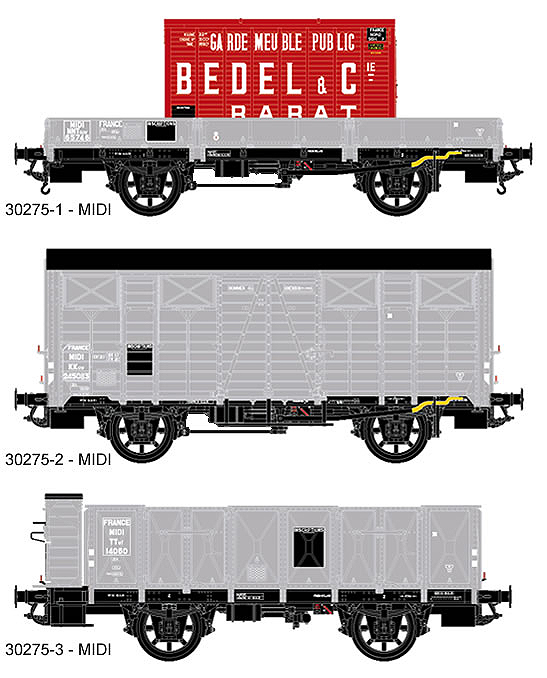 Set of 3 Freight cars consists from Gondola car type TTwf19 with brakeman cabin, flat car type NNTouw29 with container BEDEL&CO and box car type KKuw29