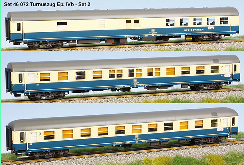 Set of 3 Passenger cars DB Touristik. Set #2. Consists from: Restaurant car type WRtm 134, passenger car 2nd class type Bctmh 257 and passenger car 2nd class type Bcmh 256
