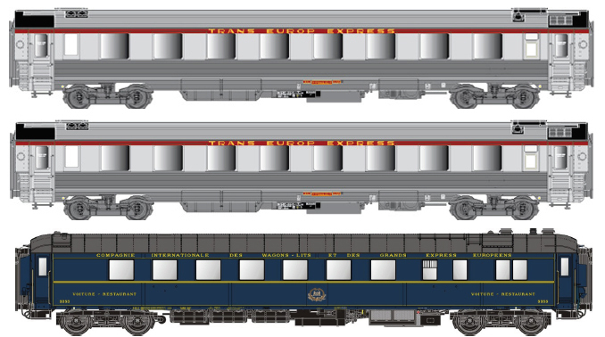 Set consists of 2 Passenger cars 1st class type A8u and Restaurant car type WRu of CIWL