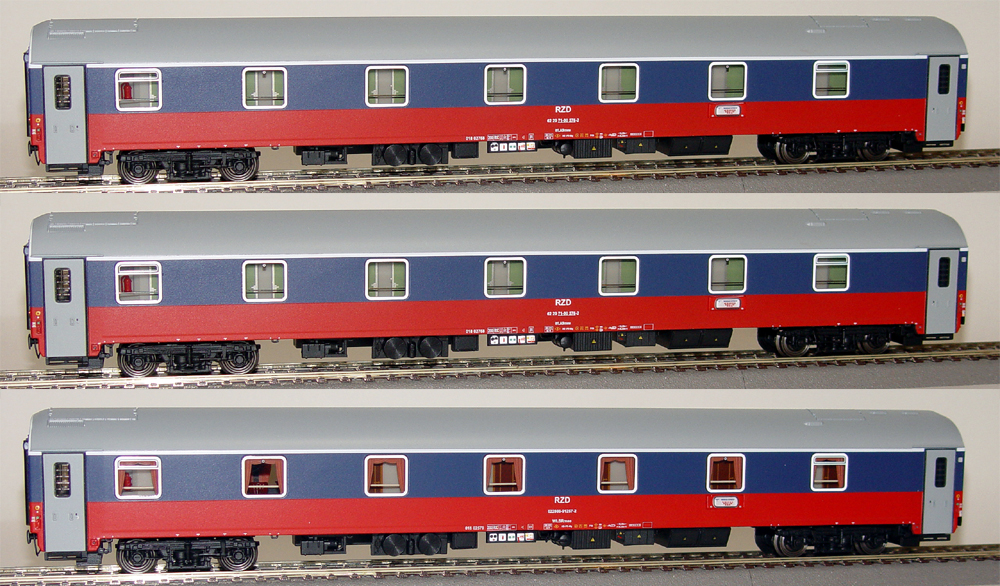 Set of 3 Passenger sleeping cars of Berlin-Moscow train in 2008 livery