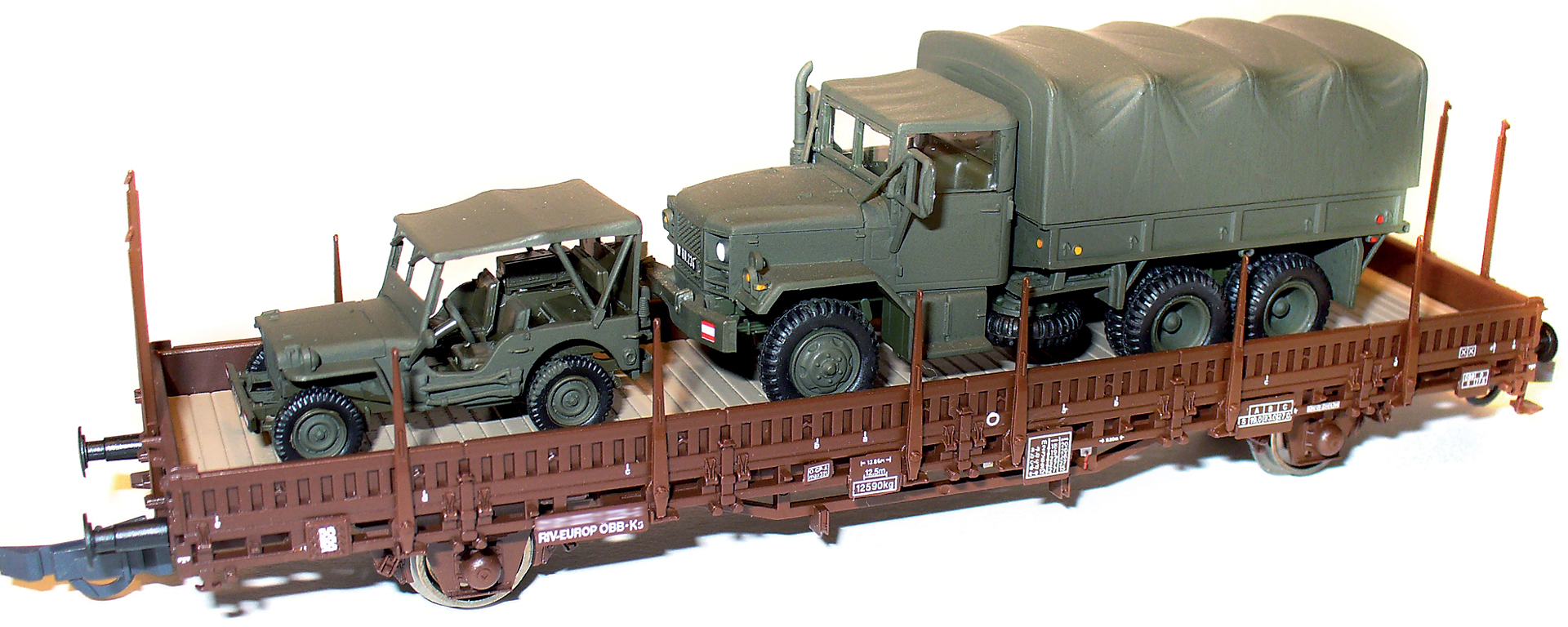 66495: 2 AXLE FLAT CAR LOADED WITH 2 MILITARY VEHICLES OF AUSTRIAN ARMY