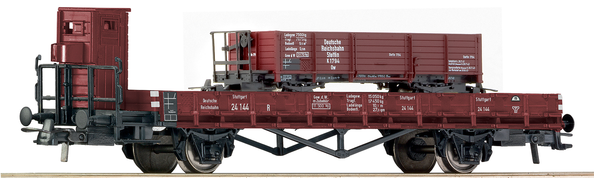 2 axle Flat car with brakemens cabin loaded with narrow gauge car