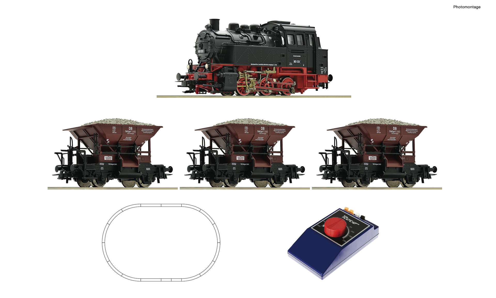 Contents: 1 Steam locomotive class 80. 3 Talbot hopper cars. 1 Transformer. 1 electric controller. . ROCO LINE without bedding: 12 Curved tracks R2, 3 Straight tracks G1, 1 Straight track G½, 1 Feeder track (G½) Size: approx. 150 x 100 cm.
