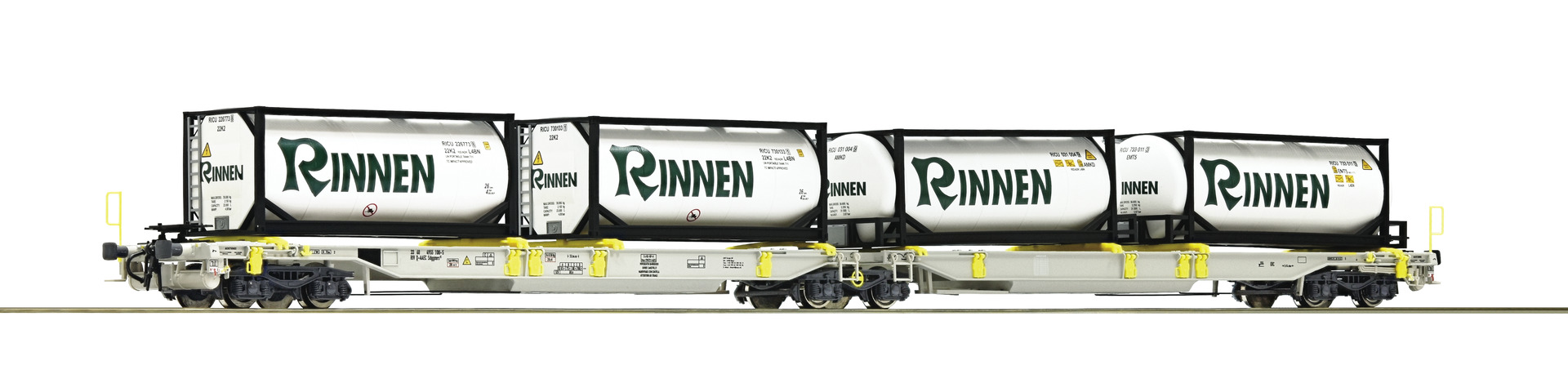 Finely detailed model with coupler pocket according to NEM 362 standards with close coupling mechanism. Carries four tank containers of the forwarding agency Rinnen.