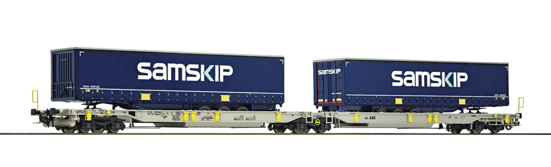 Finely detailed model with coupler pocket according to NEM 362 standards with close coupling mechanism. Carries two trailer of the forwarding agent Samskip-VanDieren