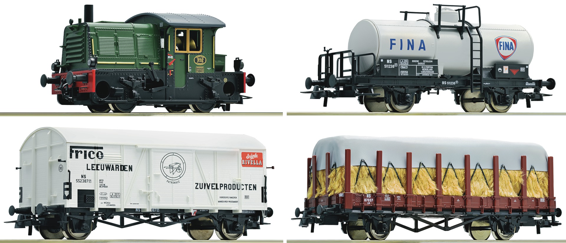 Contents: One Diesel locomotive 352 of the Dutch State Railways and one goods train that consists of one Frico boxcar, attached etched plates, one stake wagon that carries intricately fabricated straw bales.