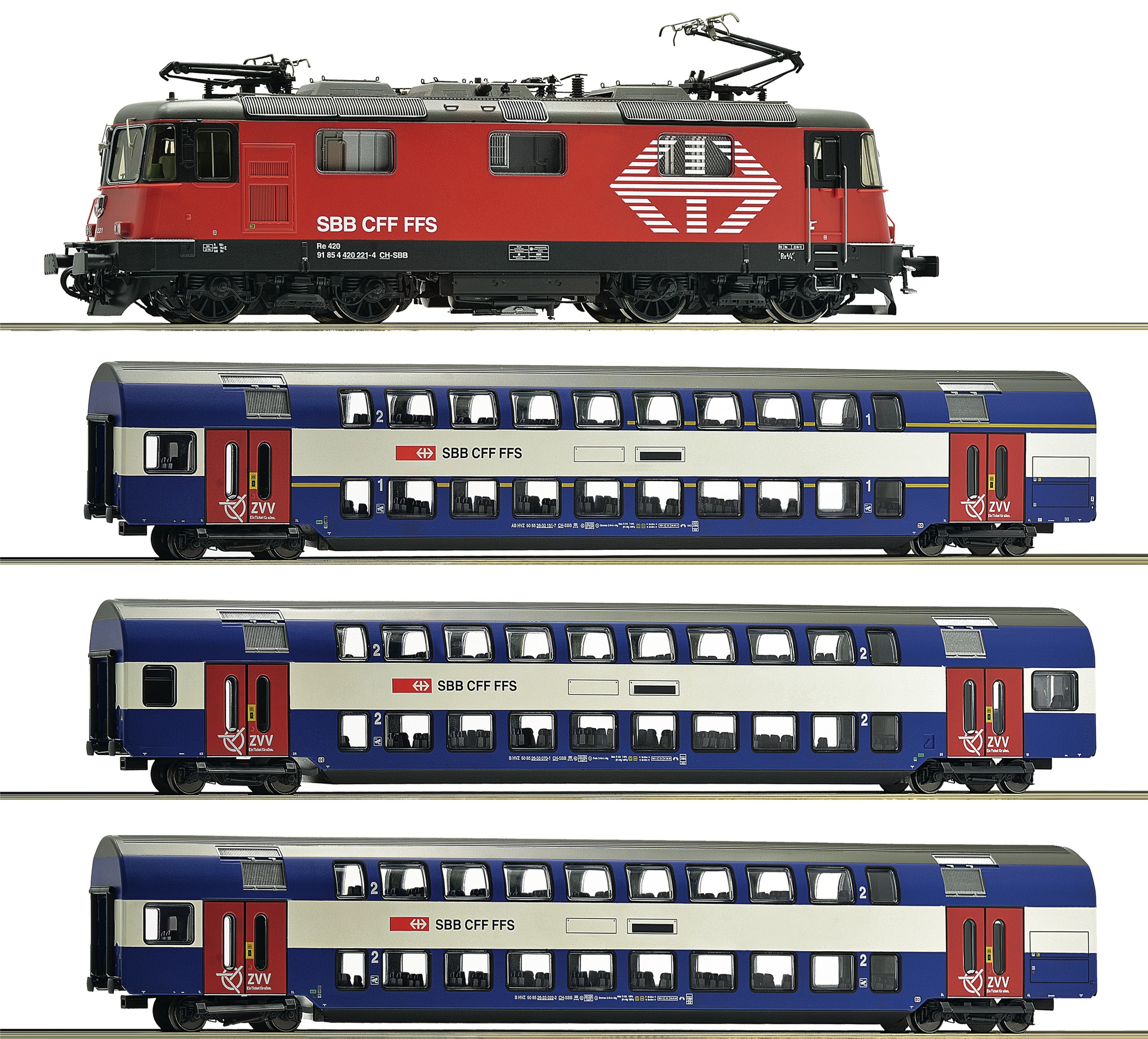 Set that consists of one electric locomotive RE 420 and three double decker cars of the Swiss Federal Railways. Electric locomotive: Elaborately detailed model of the Re 420 in Lion design of the Zurcher S-Bahn. Model with many separate plug-in parts that are partially etched. Engine with mass flywheel, drive on all four axles, one axle is equipped with a traction tire to increase the traction power, wheel sets with low flanges, LED headlight that changes automatically with the direction of travel, with digitally switchable sound functions, coupler pockets according to NEM 362 standards and with close coupling mechanism. More contents: Two 2nd class double decker cars and one in 1st/2st class double decker car manufactured by Tillig. Cars are equipped with furnished interior and interior lighting that can be retrofitted. Coupler pockets according to NEM 362 standards and with close coupling mechanism. The train set can be completed true to the original with a second consist item no. 61445 or a 2-piece wagon set item no. 64131.