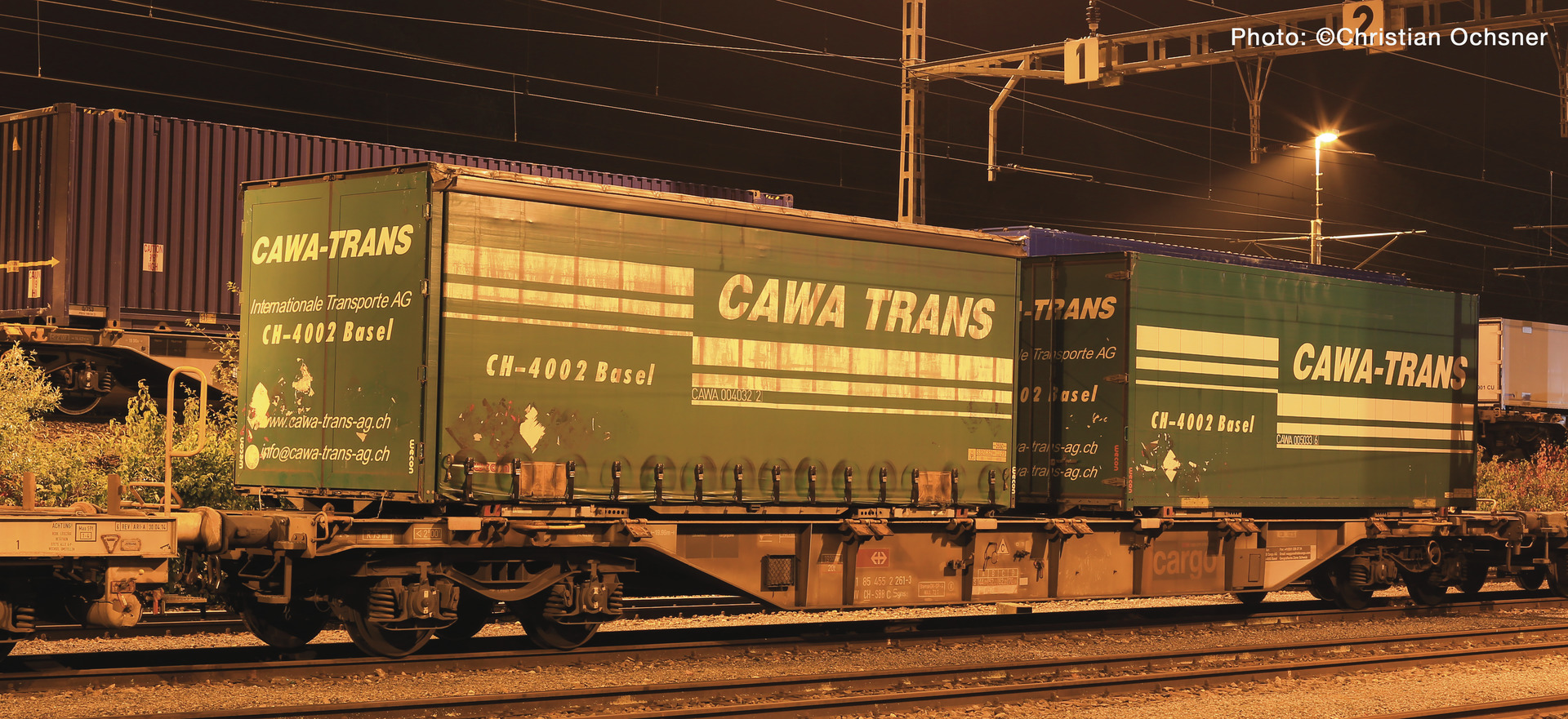 loaded with a plan flatbed and a container carrier of Cawa Trans. Coupler pocket according to NEM 362 standards with close coupling mechanism.